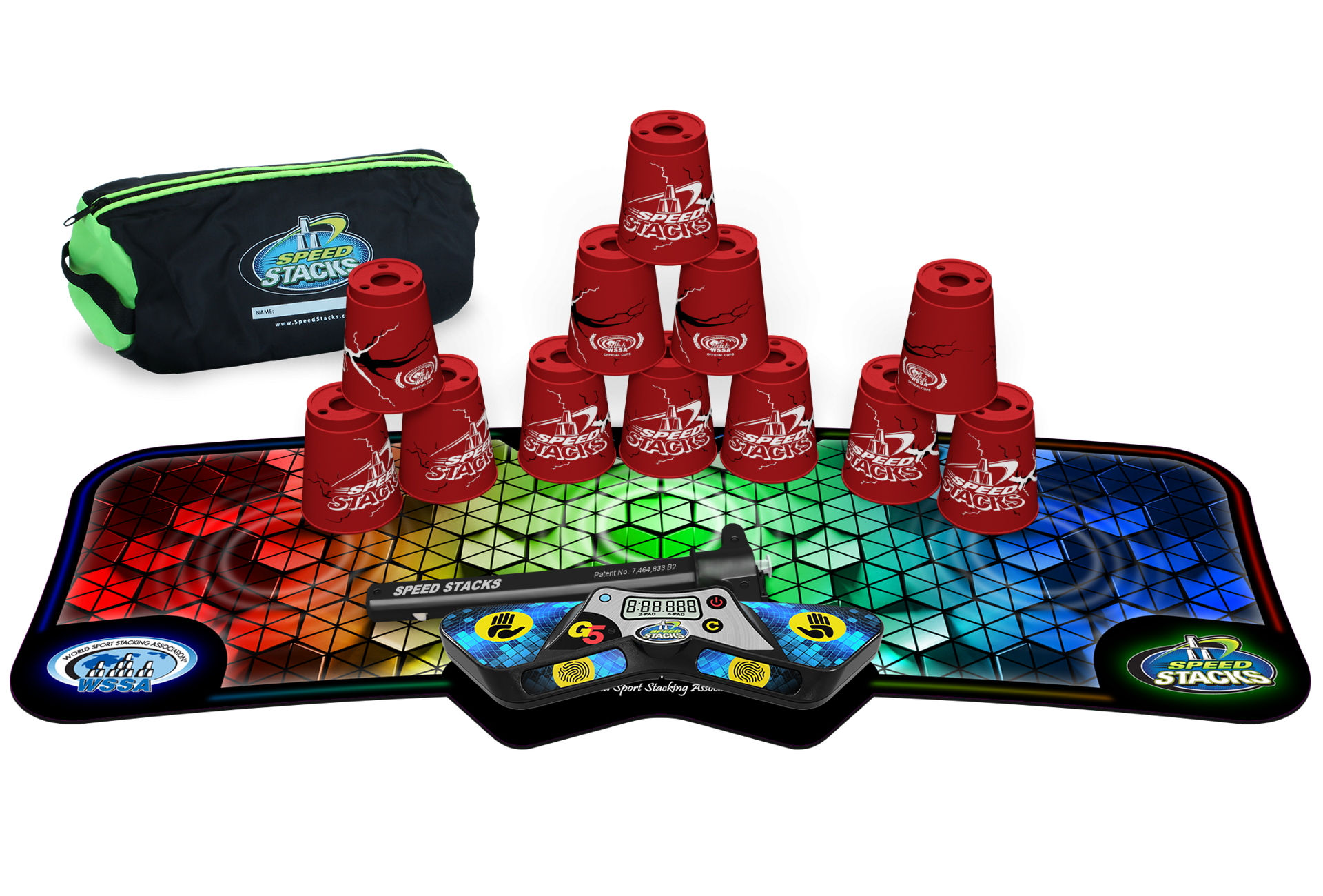 Det komplette Speed Stacks-sæt giver dig alt, hvad du behøver for at komme i gang med Sport Stacking! Sættet inkluderer dit valg af hvilken som helst kopfarve, en G5 Timer, en G5 Mat, en Quick Stem samt en Gear Bag.